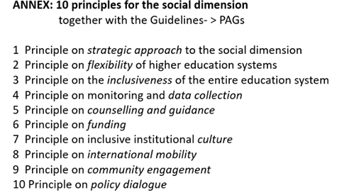 Het Rome Communiqué (2020) en het Tirana Communiqué (2024), en vooral de relevante annexen daarbij, vormen belangrijke mijlpalen voor de sociale dimensie van het hoger onderwijs binnen de Europese Hogeronderwijsruimte. In het Rome Communiqué bevestigden de ministers van Onderwijs hun engagement om sociale barrières in het hoger onderwijs te elimineren. Het doel is om tegen 2030 een beleid te hebben ontwikkeld dat zowel op overheidsniveau als op het niveau van hogeronderwijsinstellingen bijdraagt aan een inclusieve, innovatieve en verbonden Europese Hogeronderwijsruimte. De tien Principles & Guidelines in annex bij het communiqué vormen richtsnoeren voor de implementatie ervan, gericht op het verbeteren van de sociale dimensie (zie Figuur 1).
