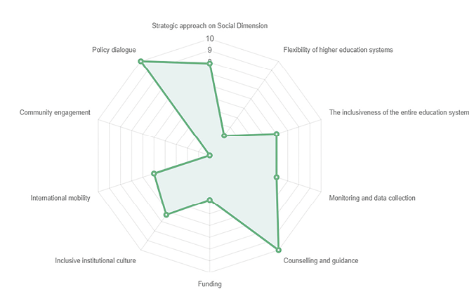Het kader vormt een waardevolle eerste stap om zich de principes, richtlijnen en indicatoren eigen te maken: wie een van de principes aanklikt, krijgt de bijhorende richtlijnen en indicatoren op een overzichtelijke manier te zien. Het zelfbeoordelingsinstrument stelt overheden en onderwijsinstellingen in staat hun huidige beleid (zelf) te evalueren. Wie het zelfevaluatieformulier invult, krijgt visuele feedback (in een spinnenwebdiagram, zie Figuur 2) en een persoonlijk rapport met advies en actiepunten, met daarin mogelijke verbeteringen van het gevoerde beleid. Ook verschijnen er voorbeelden van goede praktijken uit andere landen.