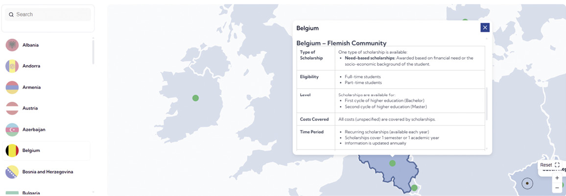 Daarnaast is er ook een zoekfunctie waarmee gebruikers de beursmogelijkheden per land in kaart kunnen brengen (Figuur 3). Als iemand specifieke informatie wil over een beurs, wordt hij of zij doorverwezen naar bestaande nationale websites. De website richt zich voornamelijk op studenten die in het land van hun onderwijsinstelling wonen. Het is belangrijk dat student-vluchtelingen, ontheemden en andere studenten met specifieke verblijfsstatuten zich ervan bewust zijn dat zij, al naargelang de lokale wetgeving, niet altijd in aanmerking komen voor alle beursmogelijkheden. Daarom blijft een belangrijke rol voorbehouden voor overheden en hogeronderwijsinstellingen om (kandidaat-)studenten te informeren over de specifieke mogelijkheden.